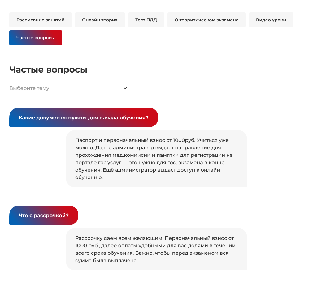Частые вопросы рассортировны по рубрикам и оформлены в виде чата