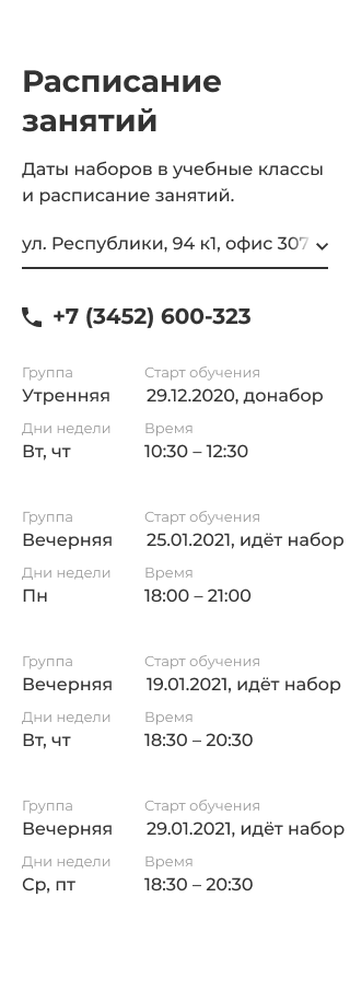 Объединил список филиалов с расписанием занятий. Можно подобрать ближайший или подальше, но с удобным расписанием.
